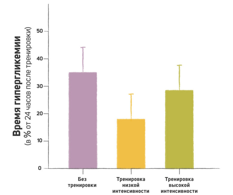 (На графике — процент времени в течение суток, когда наблюдалась гипергликемия после тренировок низкой и высокой интенсивности)