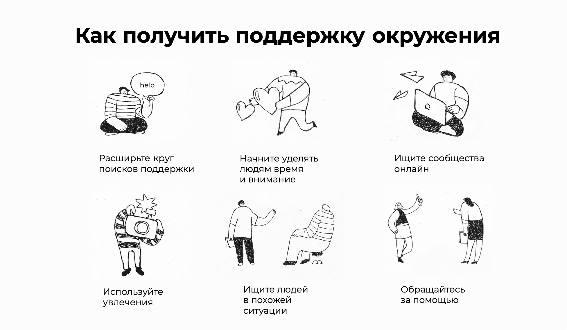 Если вы ощущаете недостаток поддержки от окружающих или с ней что-то не так, например, чат единомышленников негативит или молчит, сложно найти кого-то, кто бы разделял цели — сделайте шаг к своей поддержке.