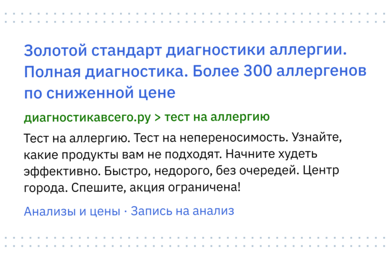 Один из самых популярных тестов сегодня — тест на антитела IgG4. Его средняя стоимость в России — 25 000 ₽, в Европе — 250−300 €. Утверждается, что он может диагностировать аллергию или пищевую непереносимость к разным видам продуктов — в зависимости от производителя теста видов может быть от 20 до 180.
