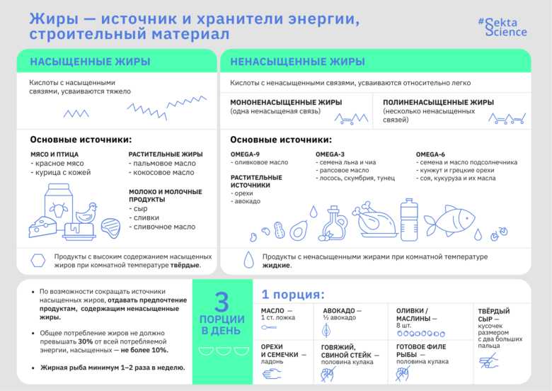 Чтобы вам было проще сориентироваться в разных видах жиров, можно воспользоваться нашей табличкой с рекомендациями, порциями и примерами. Или подробно изучить этот вопрос (от «какие виды жиров существуют» до «на каком масле лучше готовить») в нашей большой обзорной статье «Жиры»