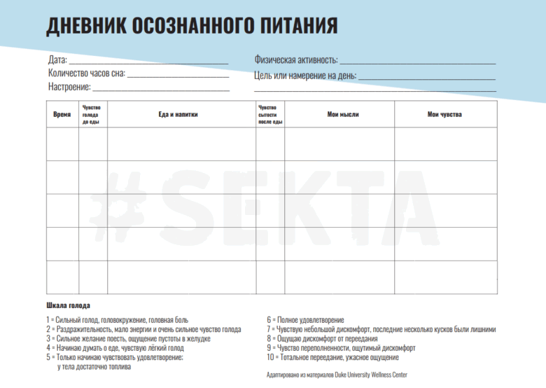 Эта версия дневника создана по материалам оздоровительного центра Университета Дьюка. Такой дневник питания отличается от привычного тем, что, кроме самих приёмов пищи, он помогает зафиксировать уровень голода и эмоциональное состояние во время еды.